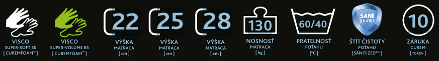 🧱 Konštrukcia: 3 vrstvy – Curemfoam™ SUPER SOFT VISCO 50, SUPER VOLUME VISCO 85, BASE MASTER 7-zónové jadro